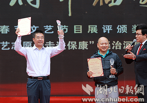 榮獲特等獎的湖北壟上頻道(右)和襄陽臺代表領(lǐng)獎。記者 劉濤攝