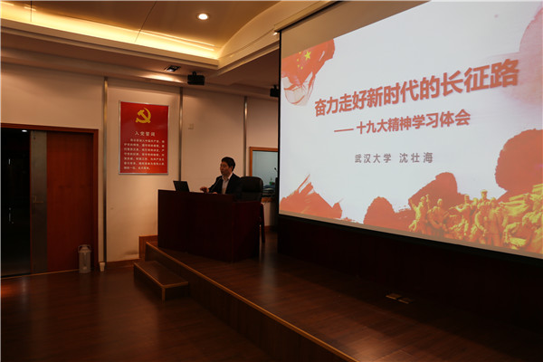 講座中,沈壯海教授以《奮力走好新時(shí)代的長征路》為題,用大量的數(shù)據(jù)和例證,從舉世矚目、時(shí)代新篇、磅礴正氣、戰(zhàn)略動(dòng)員等四個(gè)方面進(jìn)行了深入淺出的授課。在舉世矚目部分,他對(duì)黨的十九大召開的盛況進(jìn)行了總結(jié),對(duì)中國改革發(fā)展取得的輝煌成就進(jìn)行了總結(jié);在時(shí)代新篇中,他用新方位、新使命、新矛盾、新要求、新思想、新戰(zhàn)略、新征程等七個(gè)“新”對(duì)新時(shí)代、新任務(wù)進(jìn)行了闡述;在磅礴正氣部分,從不忘初心、從容自信、清醒理性、變革創(chuàng)新、團(tuán)結(jié)凝聚、自覺擔(dān)當(dāng)?shù)攘鶄€(gè)方面對(duì)黨的十九大報(bào)告進(jìn)行了生動(dòng)講解;最后,在戰(zhàn)略動(dòng)員中,他將黨的奮斗目標(biāo)高度概括為“復(fù)興夢(mèng)、強(qiáng)國夢(mèng)”,列出時(shí)間表、路線圖,還專門對(duì)以習(xí)近平同志為核心的黨中央對(duì)文化自信、文藝發(fā)展的要求和部署進(jìn)行了概括和闡釋。