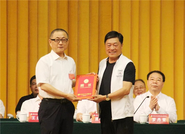 新任湖北省文聯(lián)主席劉醒龍向“老”主席熊召政頒發(fā)“名譽主席”聘書 中國藝術(shù)報記者張悅 攝