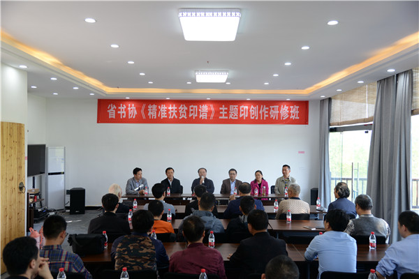 4月16日-22日,由湖北省文學(xué)藝術(shù)院、湖北省書法家協(xié)會(huì)聯(lián)合舉辦的《精準(zhǔn)扶貧印譜》主題創(chuàng)作暨迎國(guó)展篆刻研修班在大悟縣陳河村鄂北文化驛站開(kāi)班。湖北省文聯(lián)黨組成員、副主席羅丹青,孝感市文聯(lián)主席熊德琪,孝感市文聯(lián)副主席沈臘梅,省文學(xué)藝術(shù)院院長(zhǎng)鄭鳴,省書法家協(xié)會(huì)秘書長(zhǎng)李勁松,以及來(lái)自全省的20余位篆刻藝術(shù)家出席了開(kāi)班儀式。培訓(xùn)期間省文聯(lián)黨組書記、常務(wù)副主席鄧長(zhǎng)青同志;省文聯(lián)黨組成員、副主席王永平同志看望了全體學(xué)員。