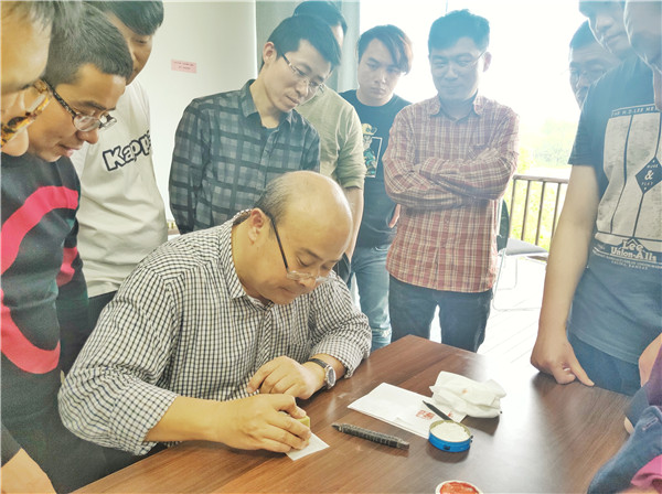 省文聯(lián)黨組成員、副主席羅丹青指出,此次研修班是省文聯(lián)和省書協(xié)經(jīng)過(guò)研究舉辦的一次專題培訓(xùn)。此次培訓(xùn)圍繞精準(zhǔn)扶貧這一當(dāng)前熱點(diǎn)主題,并結(jié)合即將到來(lái)的全國(guó)第十二屆書法篆刻作品展,進(jìn)行集中封閉培訓(xùn)。這不僅僅是一次簡(jiǎn)單的篆刻創(chuàng)作,更是希望通過(guò)此次培訓(xùn),開(kāi)拓各位藝術(shù)家的思想眼界,打通時(shí)政熱點(diǎn)和藝術(shù)創(chuàng)作的瓶頸,通過(guò)培訓(xùn)力爭(zhēng)打造一批沖刺國(guó)展的藝術(shù)精品。此次培訓(xùn)從4月16日-22日為期7天,邀請(qǐng)到中國(guó)書法家協(xié)會(huì)理事、中國(guó)書法家協(xié)會(huì)篆書委員會(huì)副主任、西泠印社理事、河南省書協(xié)副主席許雄志老師,中國(guó)書法家協(xié)會(huì)篆刻委員會(huì)委員、西泠印社社員、山東省書協(xié)副主席陳靖老師,中共湖北省委黨校經(jīng)濟(jì)學(xué)與經(jīng)濟(jì)管理教研部主任王能應(yīng)教授為學(xué)員圍繞主題印文本策劃、印稿設(shè)計(jì)、邊款處理等內(nèi)容進(jìn)行授課。期間還安排了省內(nèi)桂建明、程遲生、葉青峰、魏曉偉、李默等篆刻藝術(shù)家就個(gè)人篆刻心得進(jìn)行分享。