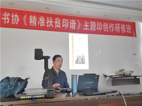據(jù)悉,此次研修班以“堅(jiān)決打好脫貧攻堅(jiān)戰(zhàn)”為主題圍繞著主題印創(chuàng)作列出“宏觀戰(zhàn)略”、“偉大愿景”、“精準(zhǔn)措施”、“拓展視野”四個(gè)方面,對(duì)國(guó)家戰(zhàn)略打響脫貧攻堅(jiān)戰(zhàn)的關(guān)鍵詞進(jìn)行了詳細(xì)的梳理和濃縮,列出了一百三十余個(gè)關(guān)鍵詞。將以此內(nèi)容為基礎(chǔ)打造一部《精準(zhǔn)扶貧印譜》,填補(bǔ)我省篆刻專題印譜空白。并舉辦《精準(zhǔn)扶貧印譜》篆刻展,展覽的印屏將捐贈(zèng)給大悟縣陳河村和鄂北文化驛站,成為其永久藝術(shù)展,增加其文藝美譽(yù)度和人文內(nèi)涵,助理陳河村脫貧致富,打造環(huán)境美、文藝美的人文鄉(xiāng)村。中國(guó)書法家協(xié)會(huì)主席蘇士澍為《精準(zhǔn)扶貧印譜》題寫書名。