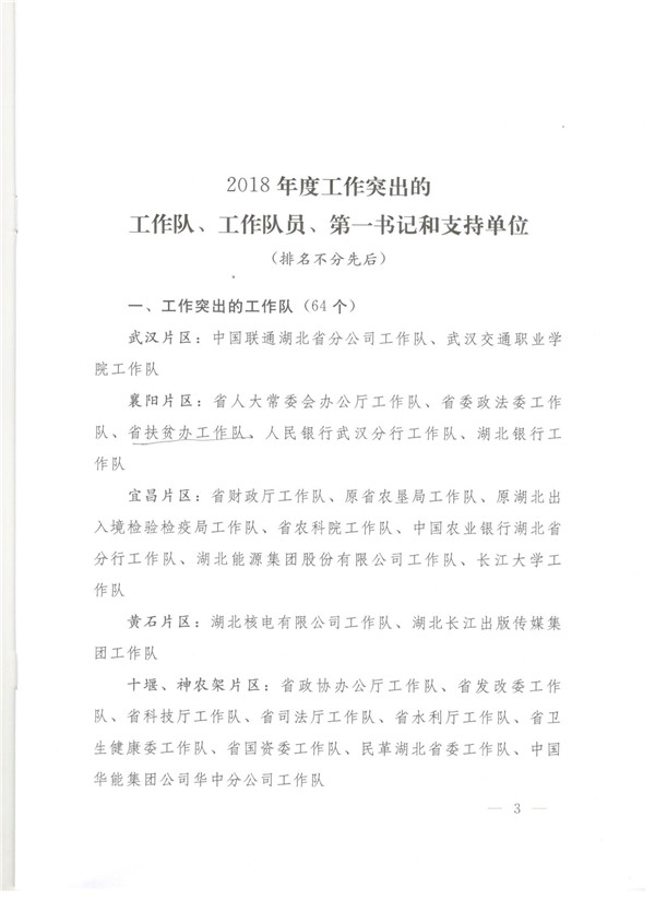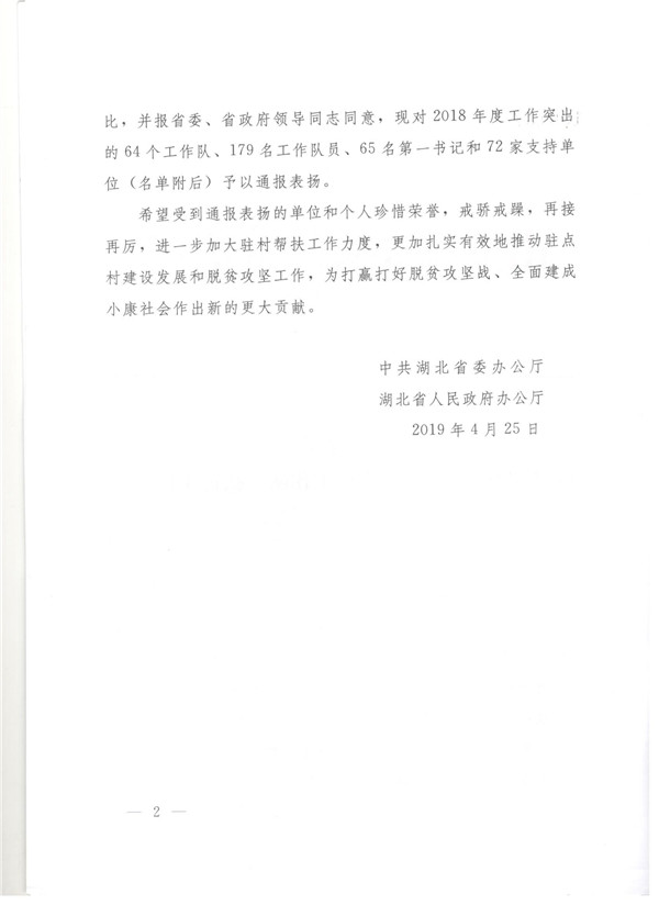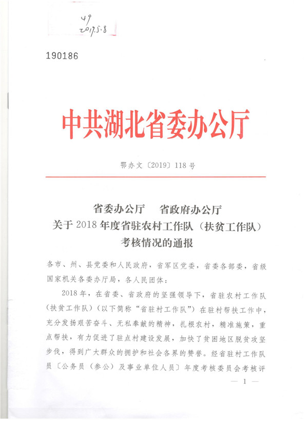 鄂辦文(2019)118號——關(guān)于2018年度省駐農(nóng)村工作隊(扶貧工作隊)考核情況的通報