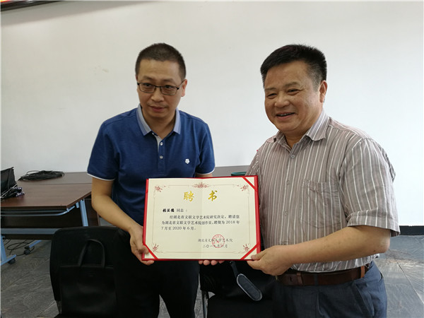 省文聯(lián)文學藝術(shù)院院長鄭鳴向省文聯(lián)文學藝術(shù)院創(chuàng)作員、著名編劇張法德頒發(fā)聘書