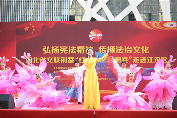 在全國法治宣傳日暨第六個國家憲法日之際,12月4日下午,湖北省文聯(lián)、湖北省演藝集團(tuán)、中共江漢區(qū)委全面依法治區(qū)委員會在武漢市旅游學(xué)校共同舉辦了省文聯(lián)荊楚“紅色文藝輕騎兵”走進(jìn)江漢區(qū)法治宣傳文藝演出活動,用文藝的形式弘揚憲法精神,傳播法治文化。