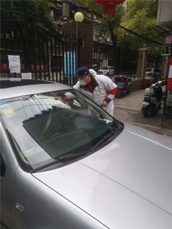 省文聯(lián)“黨員進(jìn)社區(qū)工作隊(duì)”隊(duì)員潘誠亮在涂家?guī)X社區(qū)登記來往車輛信息