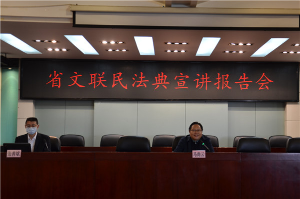 為深入學(xué)習(xí)宣傳民法典,切實推動民法典實施,2020年11月12日上午,省文聯(lián)在十樓會議室舉辦了學(xué)習(xí)《民法典》宣講報告會。報告會邀請了省委講師團成員、武漢大學(xué)法學(xué)院教授,博士生導(dǎo)師張善斌作宣講報告,省文聯(lián)黨組成員、副主席馬尚云主持會議,省文聯(lián)黨組成員、副主席肖偉池,黨組成員、副主席王永平,二級巡視員吳秋宏出席會議,省文聯(lián)全體干部職工、今古傳奇?zhèn)髅郊瘓F各企業(yè)負(fù)責(zé)人和國畫院負(fù)責(zé)人代表80余人參加了學(xué)習(xí)。