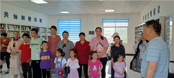 6月1日上午,王永平一行來(lái)到陳河村新時(shí)代文明實(shí)踐站,與陳河村兒童及鄉(xiāng)親們交流互動(dòng)。在擁有6000余冊(cè)藏書(shū)的陳河村圖書(shū)室兒童閱讀角,大家一起高唱“唱支山歌給黨聽(tīng)”,王永平等領(lǐng)導(dǎo)為陳河村少年兒童講紅色故事送書(shū)包文具,民間藝術(shù)家們手把手教少年兒童繡制黨旗,從小培養(yǎng)他們刺繡興趣愛(ài)好,讓他們?cè)谟仔〉男撵`里種下愛(ài)黨愛(ài)國(guó)的種子。