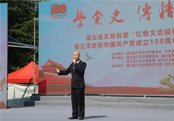 6月22日,學(xué)黨史 傳精神 跟黨走——湖北省文聯(lián)荊楚“紅色文藝輕騎兵”革命老區(qū)行在湖北省枝江市七星廣場舉行。省文聯(lián)黨組成員、副主席王永平,枝江市委書記賈立,市委副書記、市長余峰等出席活動(dòng)。