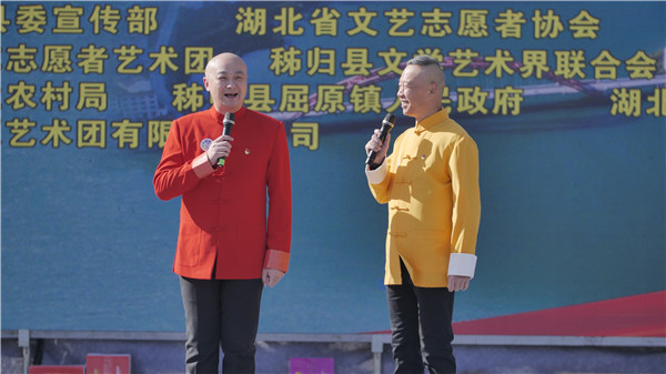當(dāng)天,學(xué)習(xí)宣傳黨的十九屆六中全會(huì)精神暨湖北省文聯(lián)“五個(gè)一”文藝工程惠民演出在秭歸縣屈原鎮(zhèn)西陵峽村屈原廣場(chǎng)舉行。歌曲《敲起琴鼓勁逮逮》《紅船》《你的答案》《把一切獻(xiàn)給黨》《豐收中國(guó)年》《常來(lái)常往》《愛(ài)家鄉(xiāng)》,雜技《力量》、川劇《變臉》、黃梅戲《江姐——春蠶到死絲不斷》輪番上演。由西陵峽村村民表演的歌舞《農(nóng)民人真?zhèn)ゴ蟆烦隽死相l(xiāng)們意氣風(fēng)發(fā)、邁向幸福生活的精氣神。相聲《說(shuō)硬道軟》、湖北大鼓《百年創(chuàng)輝煌》引來(lái)觀眾陣陣掌聲,演出在尾聲歌曲《不忘初心》中落下帷幕。