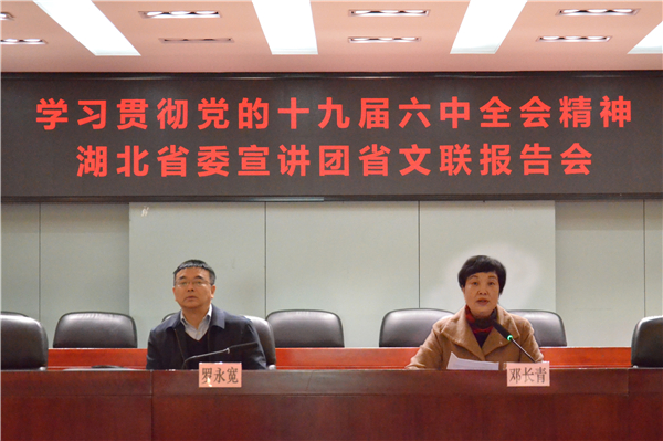 按照省直機(jī)關(guān)黨史學(xué)習(xí)教育辦公室統(tǒng)一部署,12月7日上午,黨的十九屆六中全會(huì)精神宣講報(bào)告會(huì)在省文聯(lián)舉辦。省委講師團(tuán)成員、武漢大學(xué)馬克思主義學(xué)院黨委書(shū)記、教授羅永寬同志作宣講報(bào)告。省文聯(lián)黨組書(shū)記、常務(wù)副主席鄧長(zhǎng)青,黨組成員、副主席、一級(jí)巡視員肖偉池,黨組成員、副主席王永平,黨組成員、秘書(shū)長(zhǎng)、二級(jí)巡視員雷波,二級(jí)巡視員李建華出席,省文聯(lián)全體干部職工、今古傳奇?zhèn)髅郊瘓F(tuán)各企業(yè)負(fù)責(zé)人和業(yè)務(wù)主管社會(huì)黨組織支部書(shū)記共100余人聆聽(tīng)了報(bào)告。