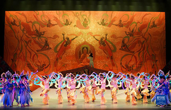 2020年1月9日,在美國紐約林肯劇院,演員在媒體預(yù)演上表演《大夢敦煌》片段。新華社記者 王迎 攝