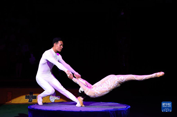 2019年9月4日,在蒙古國首都烏蘭巴托,中國河北省滄州市雜技團(tuán)演員表演雜技。新華社發(fā)(蘇力雅 攝)