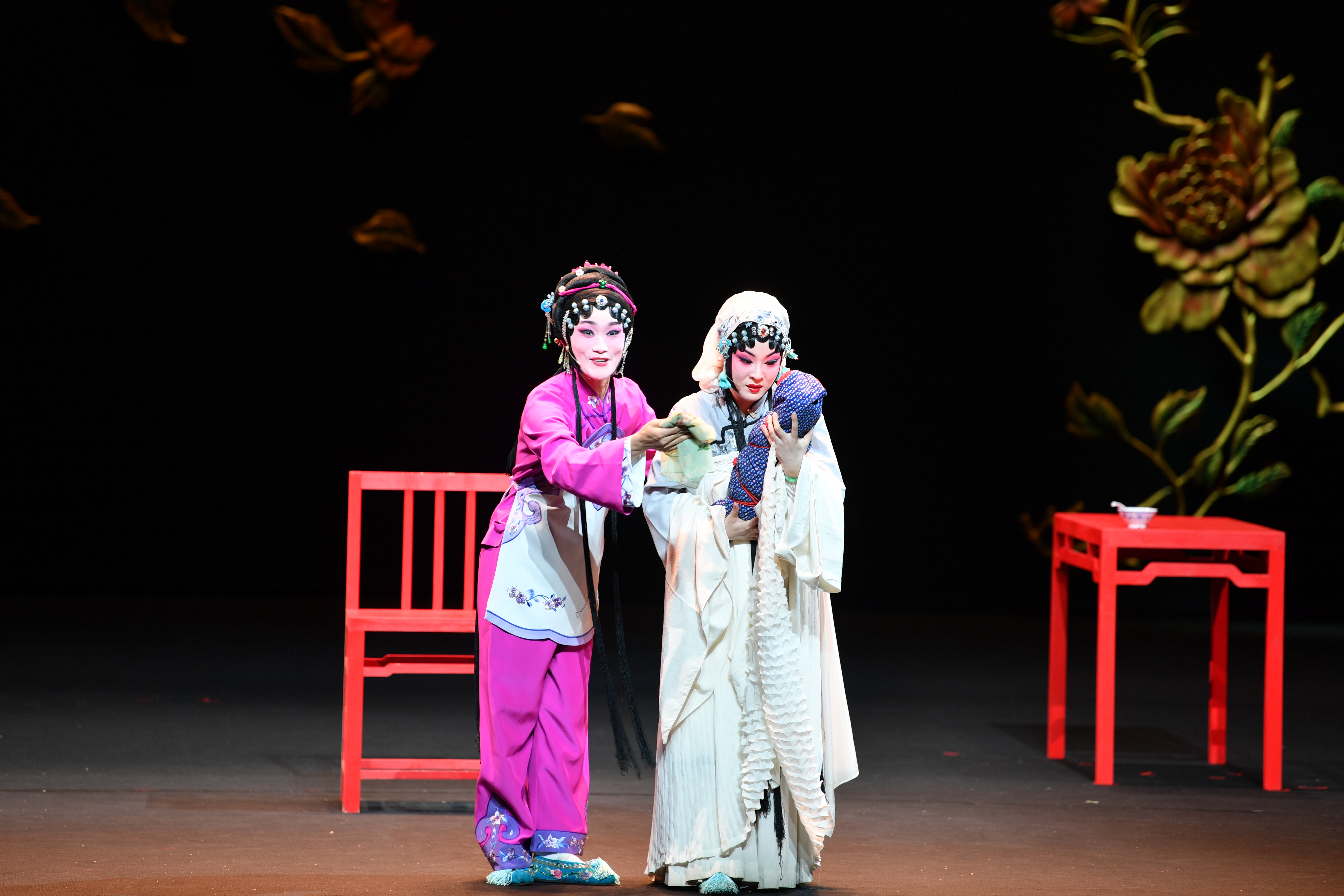 同時(shí),復(fù)排后的《羅帕記》舞美設(shè)計(jì)回歸極簡(jiǎn)風(fēng)格,以一道黑幕、一桌二椅構(gòu)成舞臺(tái)主要空間,最大限度回歸舞臺(tái)表演本身,讓觀眾充分感受到傳統(tǒng)戲曲“情由心生、境隨念轉(zhuǎn)”的獨(dú)特魅力。