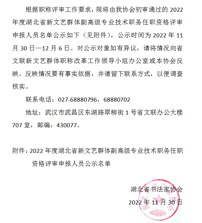 附件下載:2022年度湖北省新文藝群體副高級專業(yè)技術職務任職資格評審申報人員公示名單.xls