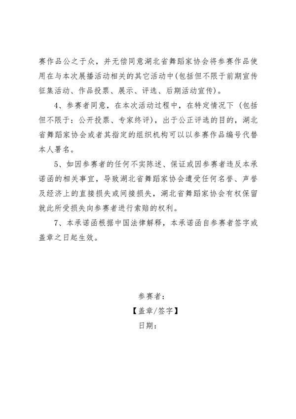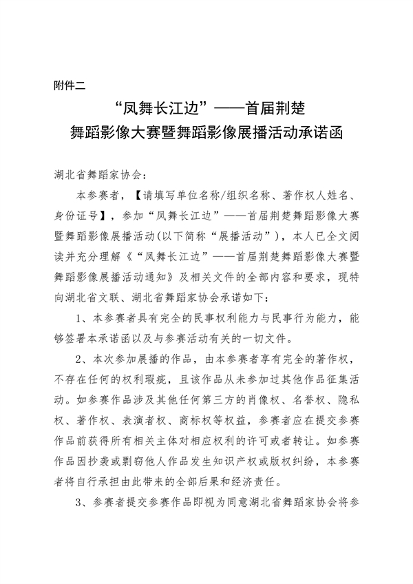 附件二:2023 年“鳳舞長(zhǎng)江邊”——首屆荊楚舞蹈影像大賽暨舞蹈影像展播活動(dòng)承諾函.doc