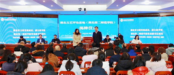 李悅、胡興共同為湖北文藝評(píng)論基地(湖北第二師范學(xué)院)揭牌并為基地聘請(qǐng)的工作委員會(huì)委員頒發(fā)了聘書。李幼平宣讀了《關(guān)于在湖北第二師范學(xué)院成立湖北文藝評(píng)論基地的決定》,劉波宣讀了《關(guān)于聘任湖北文藝評(píng)論基地(湖北第二師范學(xué)院)工作委員會(huì)組成人員的決定》,庫(kù)文靜代表湖北文藝評(píng)論基地(湖北第二師范學(xué)院)作了發(fā)言。