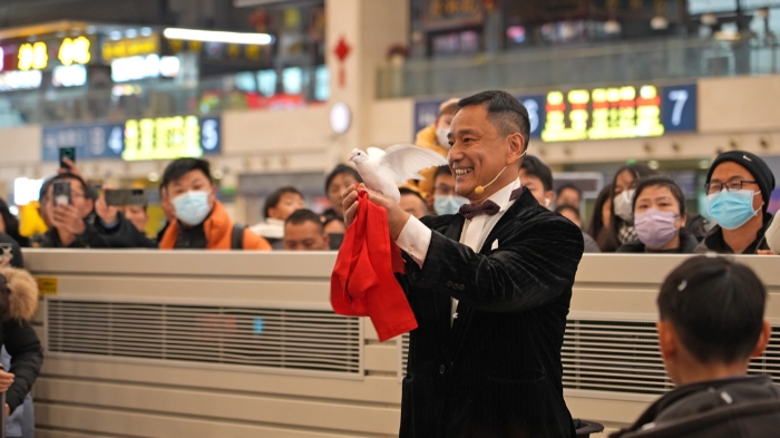 本次活動還在漢口火車站開展了一場別開生面的文藝惠民演出,特邀省內(nèi)知名藝術家徐寧、朱睿淇、蔡鑫、劉琴、吳松濤、胡啟文為漢口站的廣大旅客們帶來湖北大鼓、器樂合奏、魔術、川劇變臉等精彩節(jié)目?;顒蝇F(xiàn)場人聲鼎沸氣氛非常熱烈,旅客們或坐位子或坐行李或坐地上,叫好聲、歡呼聲如浪潮般翻涌,藝術家們也紛紛走下舞臺,與現(xiàn)場觀眾互動,神秘莫測的魔術、變臉最受孩子們的歡迎,地道幽默的湖北大鼓讓不少歸鄉(xiāng)旅客笑中有淚。演出籌備期間,正在調(diào)試樂器的藝術家們還吸引了一支特別的隊伍,這支來自意大利的科莫湖畔交響樂隊被現(xiàn)場濃厚的中國傳統(tǒng)文化氛圍所感染,熱切地表示想要加入合奏,一首《友誼天長地久》和《茉莉花》收獲了大量的贊揚與掌聲,音樂無國界,這場別開生面的器樂合奏用音樂的語言進行著中外文化交流。
