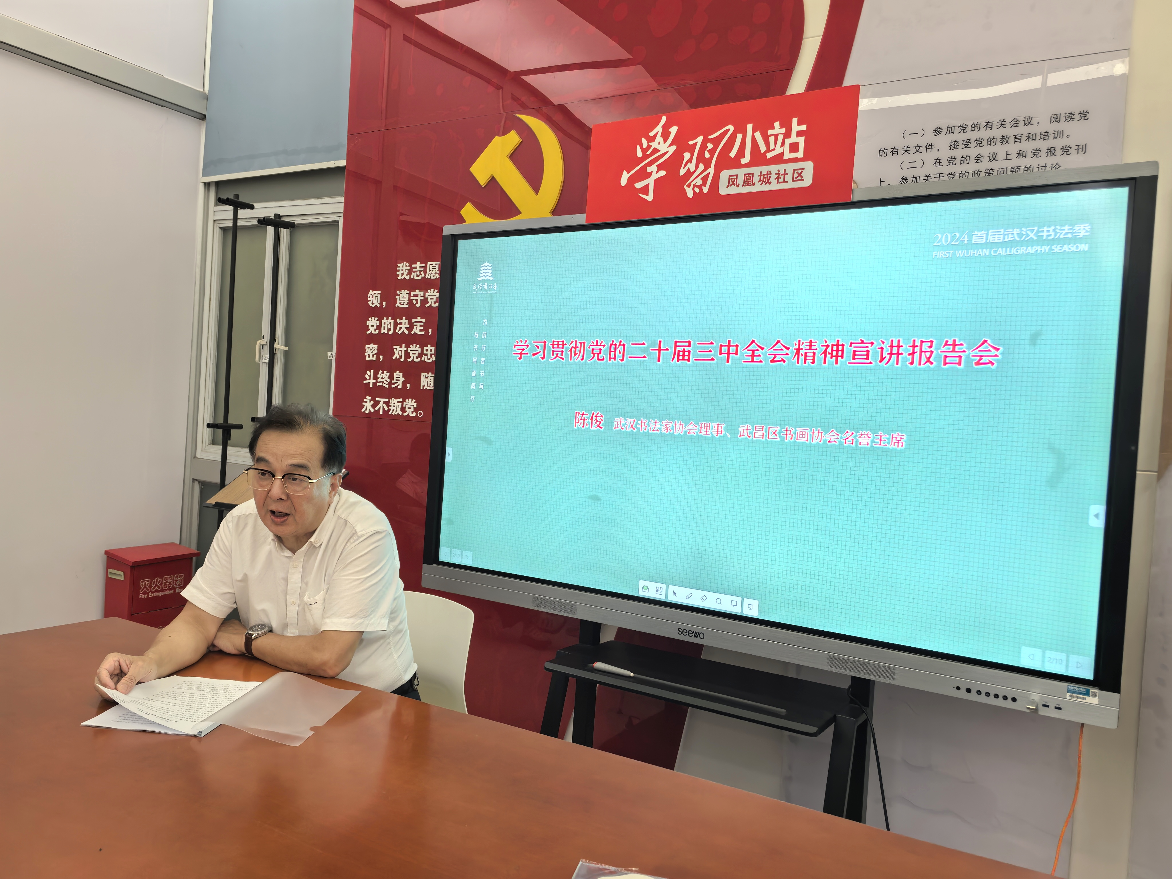根據(jù)活動安排,首先由武漢書法家協(xié)會理事、武昌區(qū)書畫協(xié)會名譽主席陳俊就個人學習黨的二十屆三中全會精神的心得體會作了宣講交流發(fā)言,發(fā)言深入淺出,深刻闡述了學好全會精神的重要性和深遠意義。同時,就結(jié)合書畫藝術(shù)創(chuàng)作提出了三點希望與大家共勉。一是堅定政治立場。要緊緊圍繞以學習《決定》為抓手,弘揚正能量,積極創(chuàng)作昂揚向上的優(yōu)秀文藝作品。二是堅定文化自信。要以弘揚學習中華優(yōu)秀傳統(tǒng)文化為己任,擔當作為,守正創(chuàng)新。三是堅守傳統(tǒng)經(jīng)典。堅持對傳統(tǒng)經(jīng)典的傳承與學習,樹立正確的藝術(shù)創(chuàng)作理念,努力創(chuàng)作無愧于時代的作品。