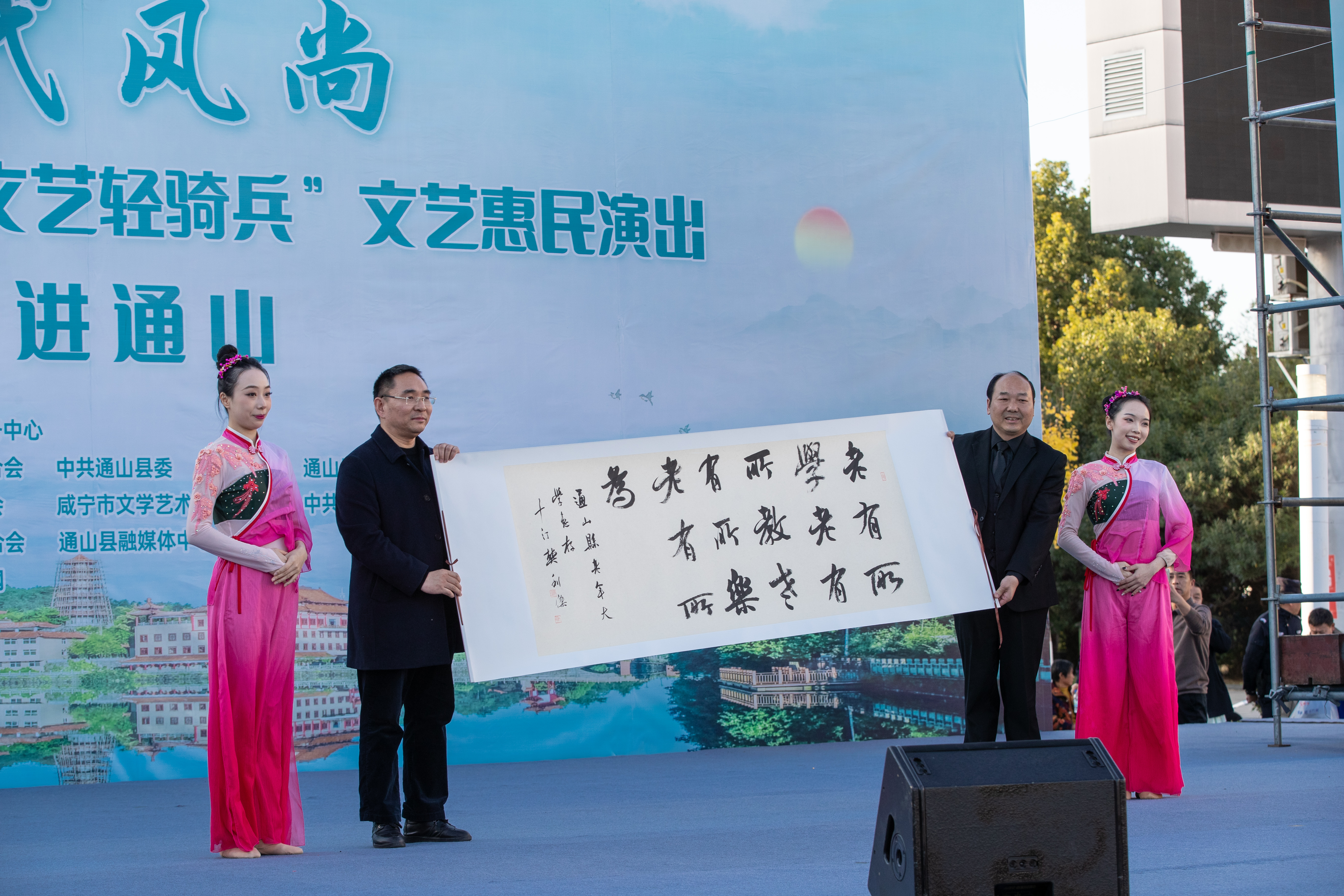 演出當(dāng)天,通山暖陽高照,廣場(chǎng)人頭攢動(dòng),氣氛熱烈。舞臺(tái)布置簡潔大氣,音響效果極佳,為演出的順利進(jìn)行提供了有力的保障。主辦方還特意設(shè)置了猜謎環(huán)節(jié)和書法攝影作品贈(zèng)送環(huán)節(jié),中國書協(xié)行書委員會(huì)委員、湖北省書協(xié)副主席、湖北省書法院副院長、中國書法蘭亭獎(jiǎng)獲得者樊利杰現(xiàn)場(chǎng)為通山縣贈(zèng)送書法作品。增加了觀眾的互動(dòng)性和參與感,使整個(gè)活動(dòng)更加生動(dòng)有趣。