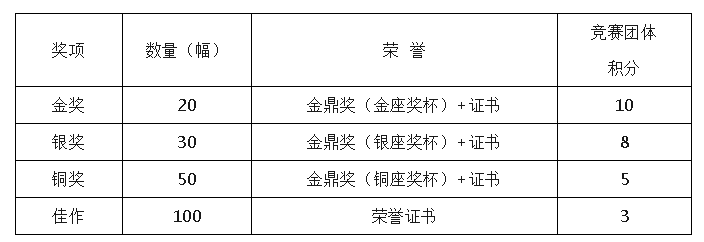 2.比賽還設團體獎三個單位,以金獎作品計10分,銀獎作品計8分,銅獎作品計5分,佳作計3分計算同一省份的作者獲得獎分為團體總分,排列前三甲者,為大賽團體獎冠軍、亞軍、季軍,由主辦單位頒發(fā)“金鼎獎”團體獎杯。