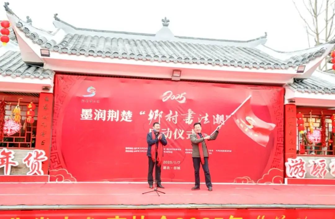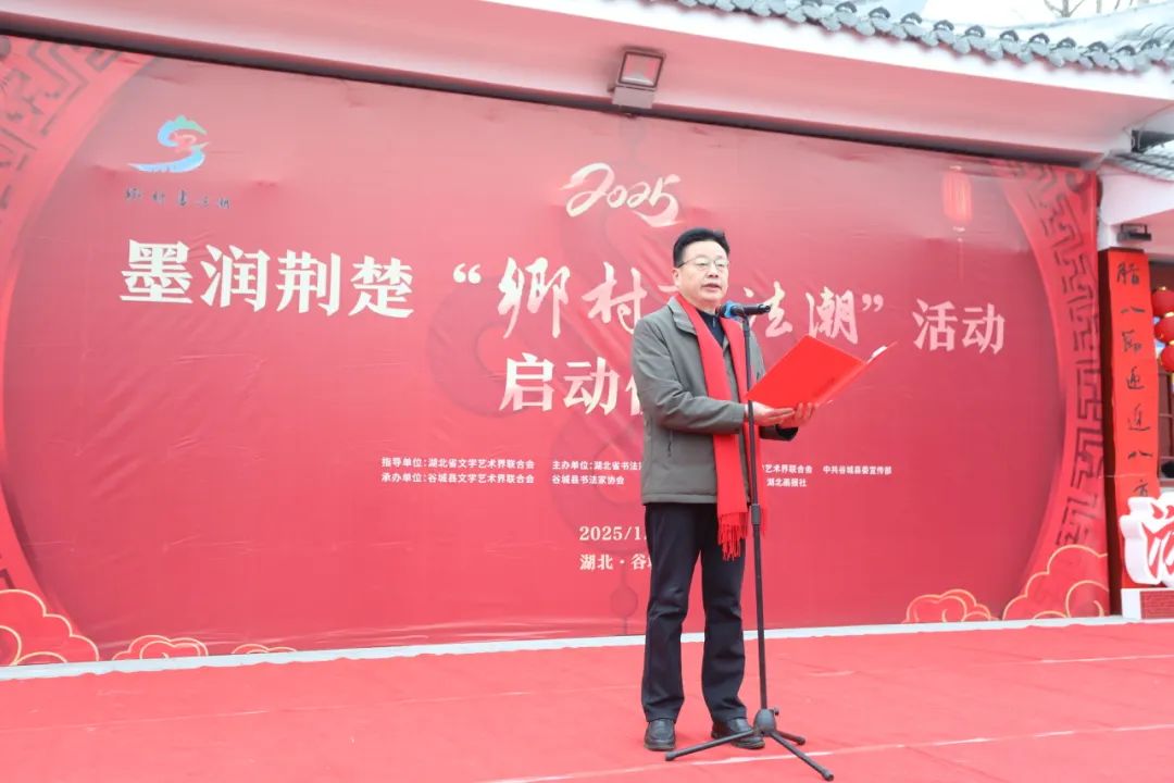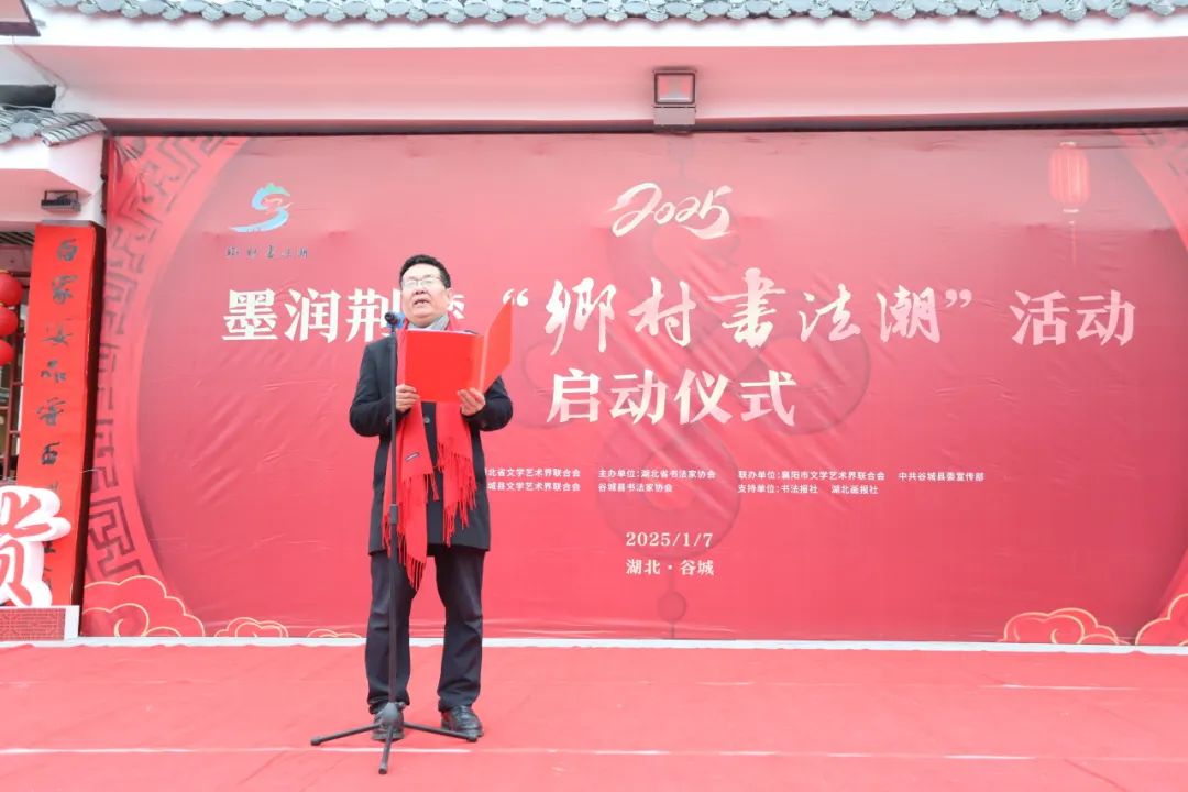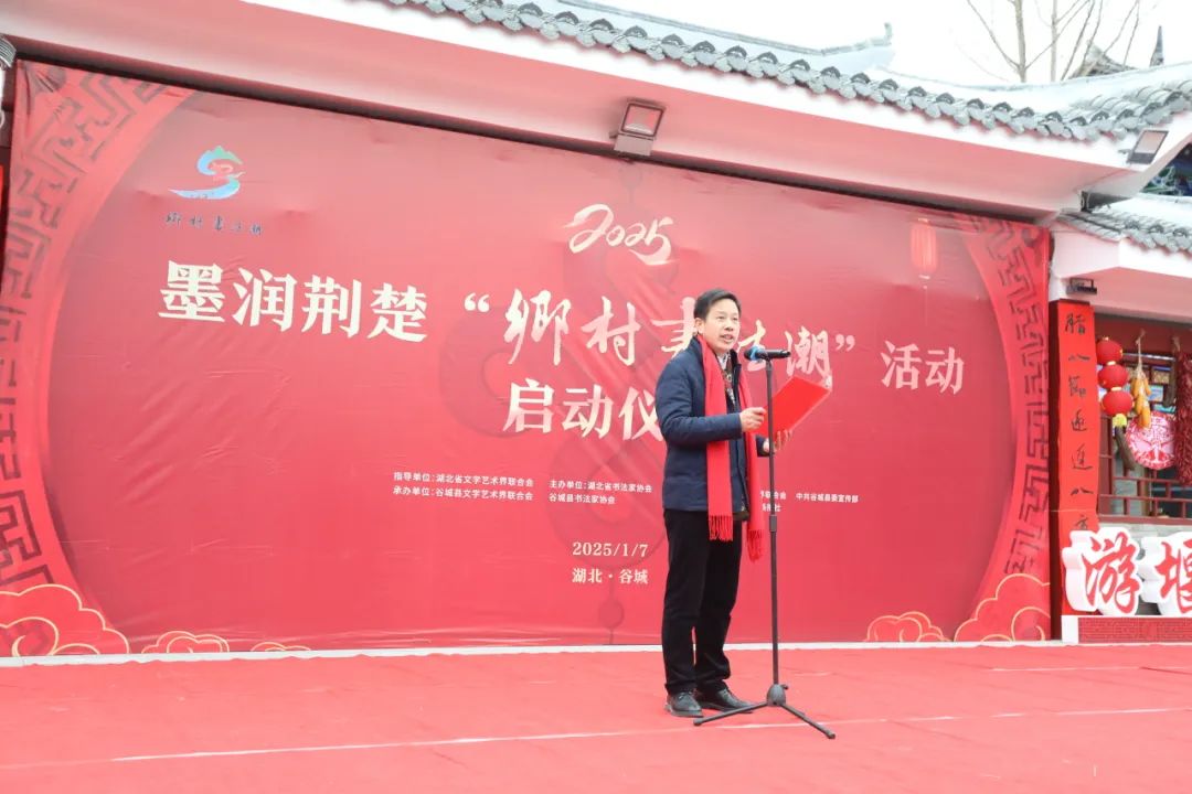 為深入學(xué)習(xí)貫徹黨的二十屆三中全會(huì)精神和習(xí)近平總書(shū)記考察湖北重要講話精神,1月7日,根據(jù)湖北省文聯(lián)、湖北省書(shū)協(xié)部署,2025墨潤(rùn)荊楚“鄉(xiāng)村書(shū)法潮”活動(dòng)啟動(dòng)儀式在湖北省谷城縣五山鎮(zhèn)堰河村隆重舉行。湖北省文聯(lián)黨組成員、秘書(shū)長(zhǎng)張海旺,湖北省文聯(lián)副主席、省書(shū)協(xié)主席孟慶星,湖北省美術(shù)院黨委書(shū)記李和清,湖北省書(shū)協(xié)副主席馬武、王勇、樊利杰,湖北畫(huà)報(bào)社董事長(zhǎng)陳明華,襄陽(yáng)市委宣傳部副部長(zhǎng)柯紅勇,襄陽(yáng)市文聯(lián)黨組成員、副主席任偉,谷城縣委常委、宣傳部部長(zhǎng)胡明學(xué)以及省書(shū)協(xié)第六屆專(zhuān)業(yè)委員會(huì)主任、副主任代表,骨干書(shū)家代表參加啟動(dòng)式。啟動(dòng)式由省書(shū)協(xié)駐會(huì)副主席、秘書(shū)長(zhǎng)李勁松主持。
