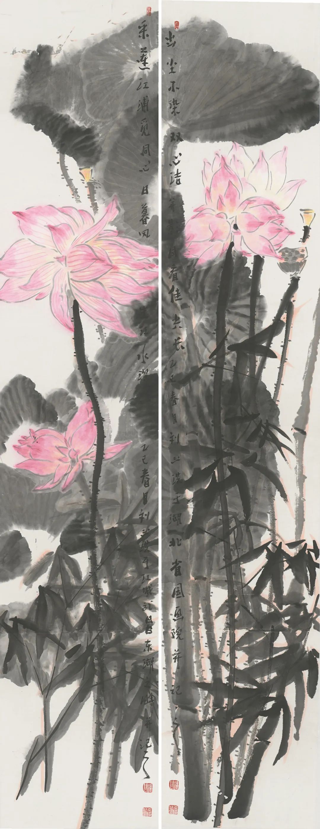 劉正洪 國畫 出塵不染雙心潔 178cm×34cm×2 2025年