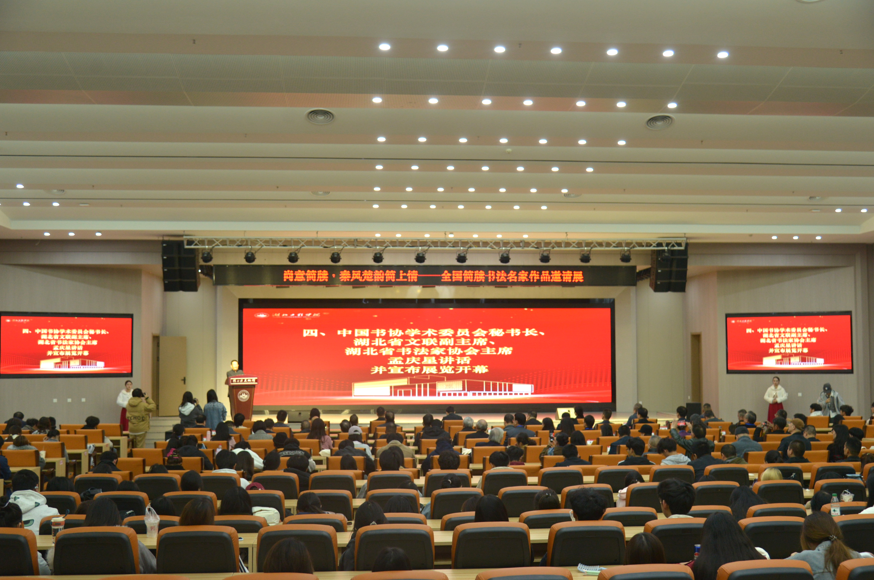 開(kāi)幕式上孝感市人民政府副市長(zhǎng)朱江,湖北工程學(xué)院黨委書(shū)記盧雪梅,中國(guó)書(shū)協(xié)學(xué)術(shù)委員會(huì)秘書(shū)長(zhǎng)、湖北省文聯(lián)副主席、書(shū)協(xié)主席孟慶星,湖北省書(shū)協(xié)副主席、湖北省書(shū)法院副院長(zhǎng)樊利杰分別致辭,開(kāi)幕式由湖北工程學(xué)院黨委副書(shū)記陳偉主持。來(lái)自省內(nèi)外的書(shū)法創(chuàng)作者、文化學(xué)者及觀眾300余人參加活動(dòng),隨后進(jìn)行了“云夢(mèng)秦簡(jiǎn)書(shū)藝傳承與活化利用”學(xué)術(shù)交流座談會(huì)。