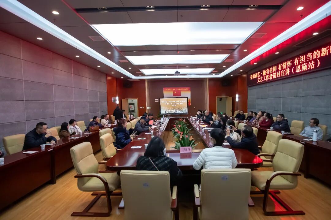 采風(fēng)期間,舉辦了崇德尚藝·做有信仰、有情懷、有擔(dān)當(dāng)?shù)男聲r(shí)代文藝工作者巡回宣講,省文聯(lián)黨組成員、副主席王永平作《深入貫徹習(xí)近平文化思想 勇于擔(dān)當(dāng)新時(shí)代文化使命》主題宣講,恩施州文聯(lián)、恩施州各文藝家協(xié)會(huì)以及采風(fēng)團(tuán)成員參加宣講。恩施州文聯(lián)專職副主席張情介紹了恩施州文藝志愿相關(guān)情況,采風(fēng)團(tuán)成員尤一心、劉智鵬就本次采風(fēng)活動(dòng)所感、所得依次進(jìn)行交流發(fā)言。
