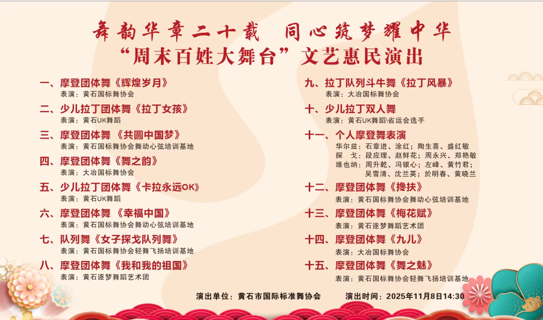 此次演出由市國(guó)標(biāo)舞協(xié)會(huì)精心策劃籌備,得到了大冶市國(guó)標(biāo)舞協(xié)會(huì)、黃石UK舞蹈協(xié)會(huì)等近十個(gè)成員單位的積極響應(yīng)。參演者涵蓋少年兒童、中青年及資深愛好者,經(jīng)過數(shù)月編排打磨的節(jié)目,在藝術(shù)表現(xiàn)力與技術(shù)規(guī)范性上兼具高水準(zhǔn)。