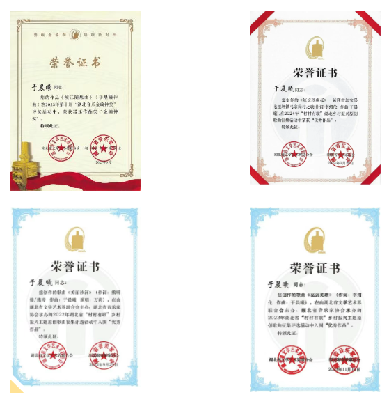2023年10月?lián)胃枨读羷τ⑿邸纷髑?,獲2023年湖北省“村村有歌”鄉(xiāng)村振興主題原創(chuàng)歌曲優(yōu)秀獎(jiǎng)。