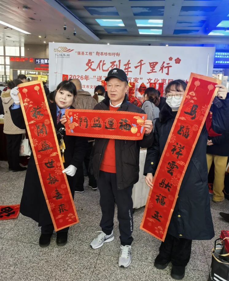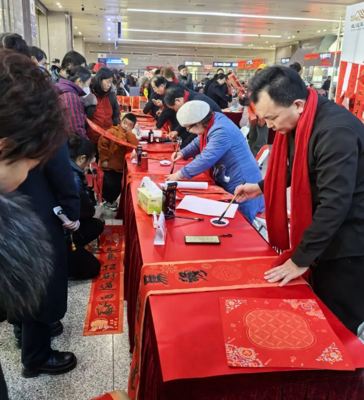 馬踏祥云報(bào)喜至,燕裁細(xì)柳送福來。2月2日春運(yùn)首日,“強(qiáng)基工程”——文化列車千里行·送萬福進(jìn)萬家暨武漢市文聯(lián)“我們的中國(guó)夢(mèng) 文化進(jìn)萬家”新春特別行動(dòng)走進(jìn)武昌火車站。武漢市文聯(lián)組織多位書法家、民間文藝家現(xiàn)場(chǎng)書寫春聯(lián)、剪窗花、制作手工藝品,贈(zèng)送給過往旅客,為春運(yùn)旅途增添濃濃年味。