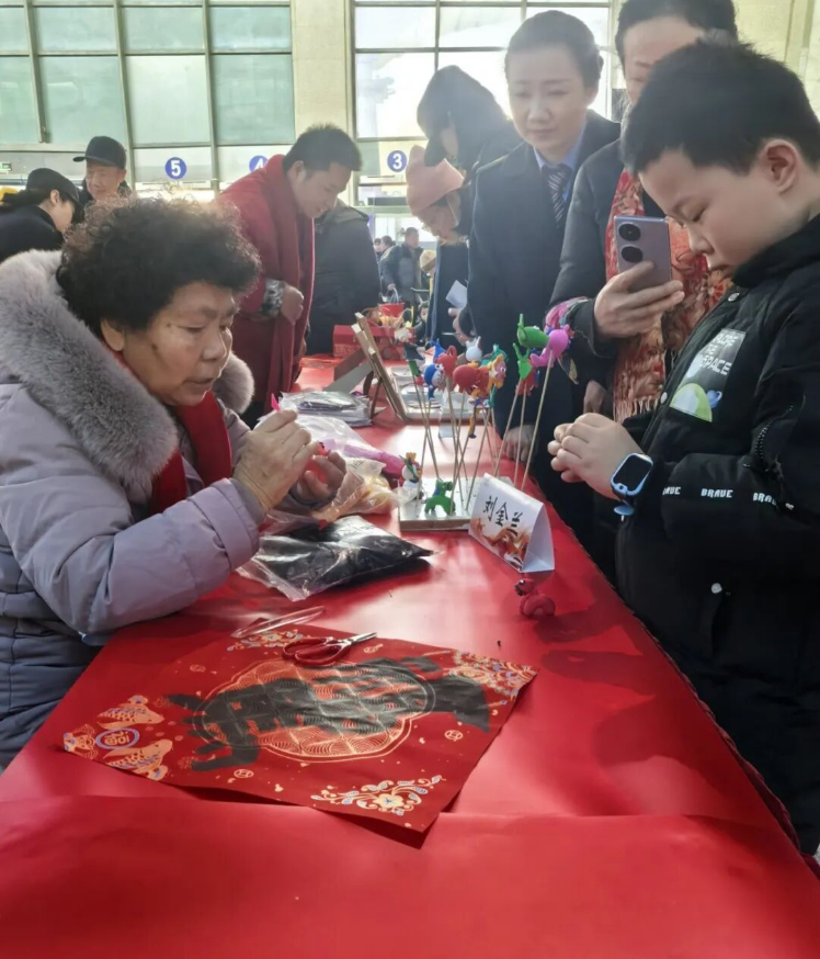 民間文藝家的展臺(tái)也大受歡迎,剪紙大師巧手翻飛,一幅幅寓意吉祥的窗花很快呈現(xiàn)在大家面前。面塑非遺傳承人一邊創(chuàng)作一邊講解面塑技藝的歷史淵源與制作技巧,讓大家在觀賞與互動(dòng)中,讀懂非遺作品的文化內(nèi)涵。不少旅客停下匆匆腳步,有序排隊(duì)領(lǐng)取這份特別的“年禮”。