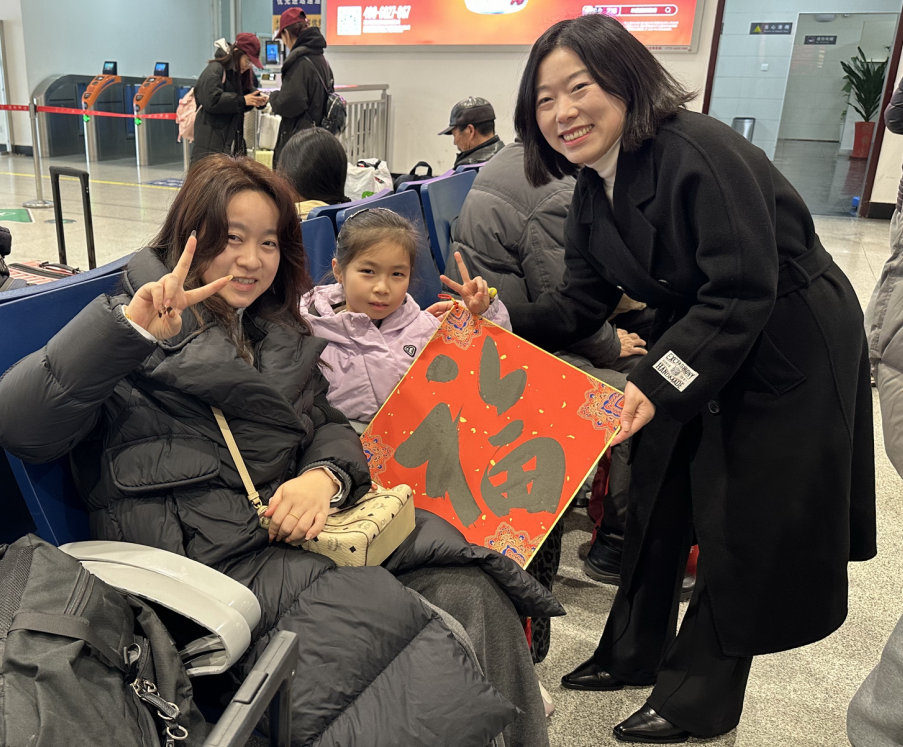 “春運期間能在車站感受到這樣濃厚的文化氛圍,既緩解了候車的枯燥,又收獲了滿滿的祝福,特別暖心?!甭每湍弥郝?lián)和剪紙作品,連連為活動點贊。