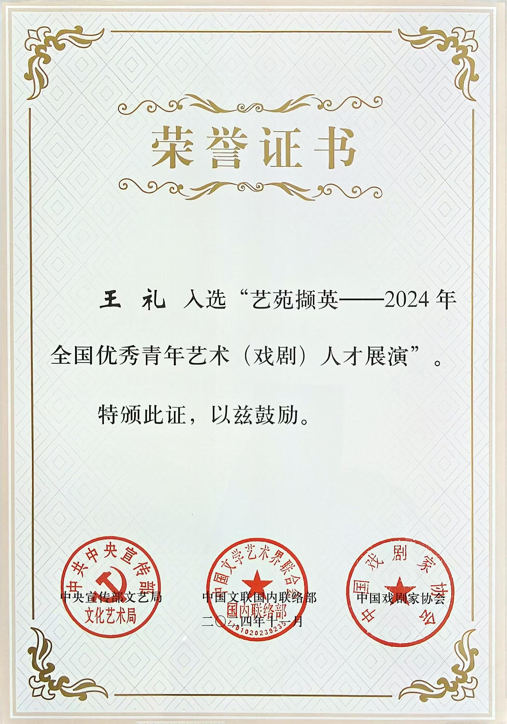 11月,經(jīng)我會(huì)推薦,湖北省京劇院優(yōu)秀青年演員王禮在中宣部文藝局、中國文聯(lián)國內(nèi)聯(lián)絡(luò)部和中國劇協(xié)主辦的“藝苑擷英——2024全國優(yōu)秀青年藝術(shù)(戲?。┤瞬耪寡荨敝蝎@得榮譽(yù)。